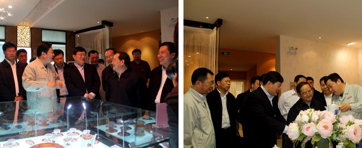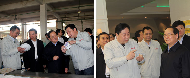 2012年4月6日江西省人民政府省長鹿心社一行在市委書記鄧保生、市長劉昌林等省市領(lǐng)導(dǎo)的陪同下來我司視察工作,鹿心社省長一行參觀了工廠生產(chǎn)車間、國瓷館,詳細了解了公司的生產(chǎn)運營情 況并對公司產(chǎn)品贊不絕口。視察期間,鹿心社省長對公司給予了高度評價:“你們公司為景德鎮(zhèn)爭了光,為江西爭了光,為國家爭了光。"并希望公司能牢牢抓住精品路線,抓住高端市場,搞活機制,繼續(xù)做的更大更好。