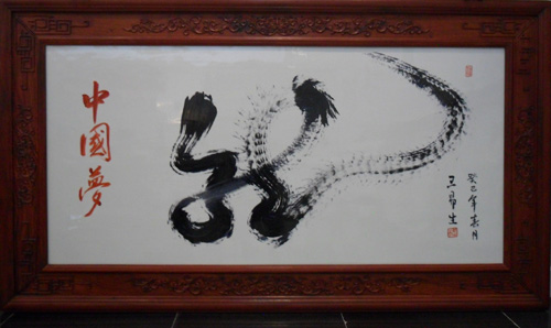 在當天的活動中,王易生的草書一筆龍,已達到了較高的藝術境界,其一氣呵成的書寫方式在書畫界更是一絕?!褒垺弊值那安肯笳髦腥A兒女祈福納祥,國泰民安;中部象征著中華大地改革之勢,波瀾壯闊;尾部象征著中華民族偉大復興、巨龍騰飛、正當其時。“龍尾”,似騰龍奔逐,奇幻莫測,給人極強的心靈震撼。