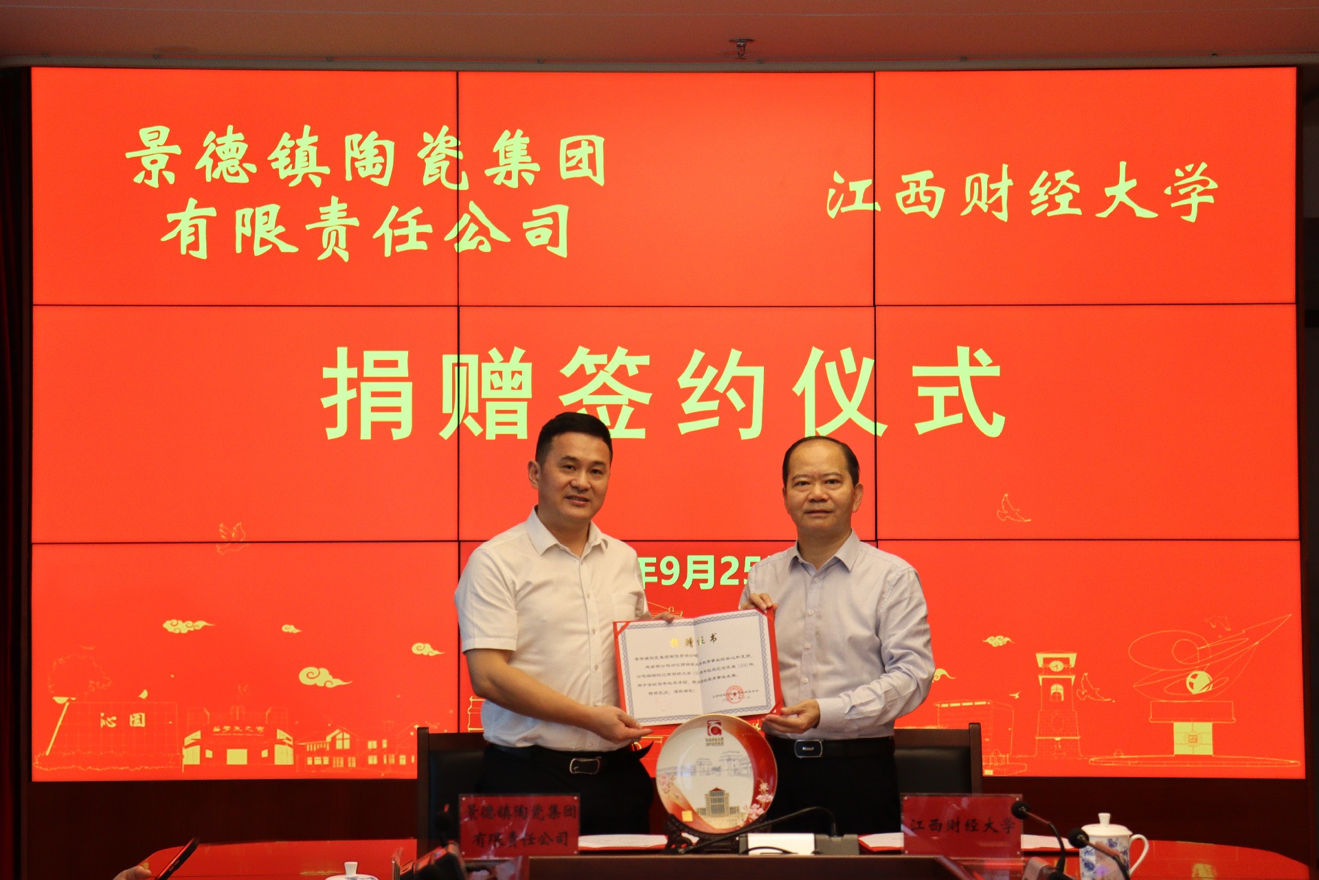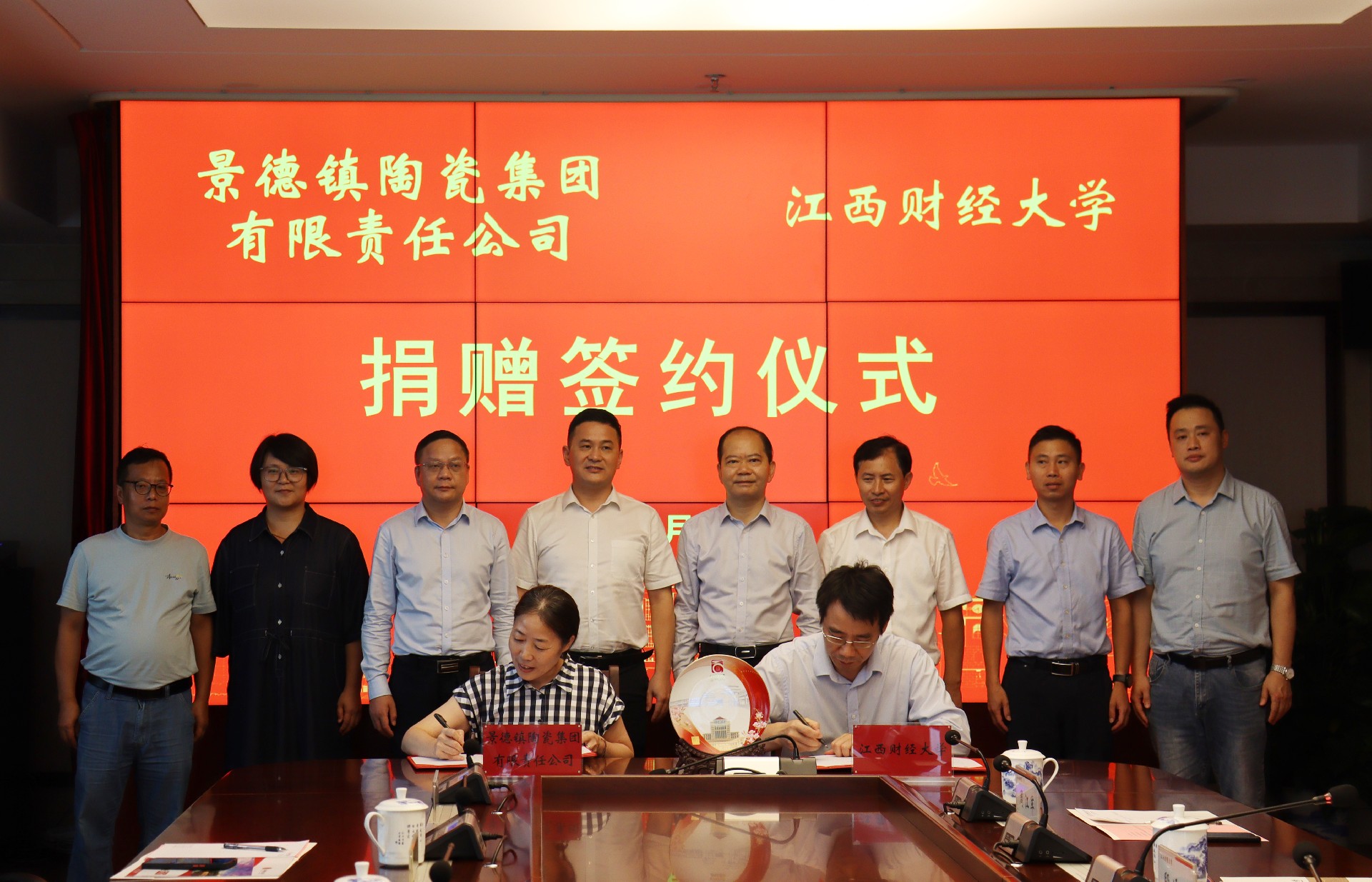 簽約儀式上,吳愛(ài)云代表景陶集團(tuán)與江西財(cái)經(jīng)大學(xué)簽署捐贈(zèng)協(xié)議,并捐贈(zèng)紀(jì)念瓷盤(pán),鄧景揚(yáng)代表景陶集團(tuán)接受江西財(cái)大頒發(fā)的《捐贈(zèng)證書(shū)》。