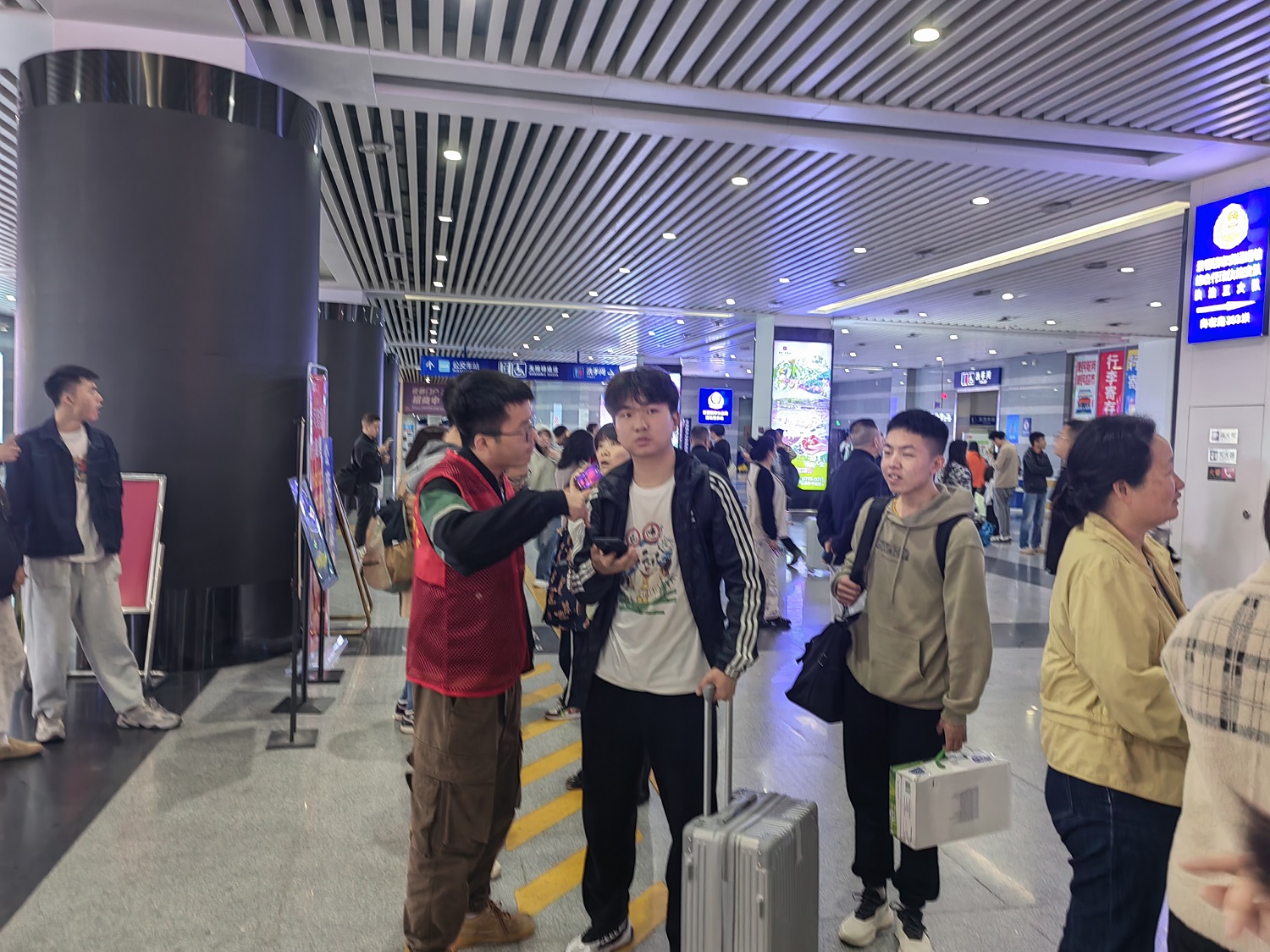 在各服務(wù)站點(diǎn),志愿者們一會(huì)兒化身導(dǎo)游,一會(huì)兒化身美食家,一會(huì)兒化身行李俠……為旅客提供周到的服務(wù),旅客們紛紛點(diǎn)贊志愿者們熱心、舒心、暖心!
